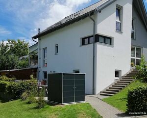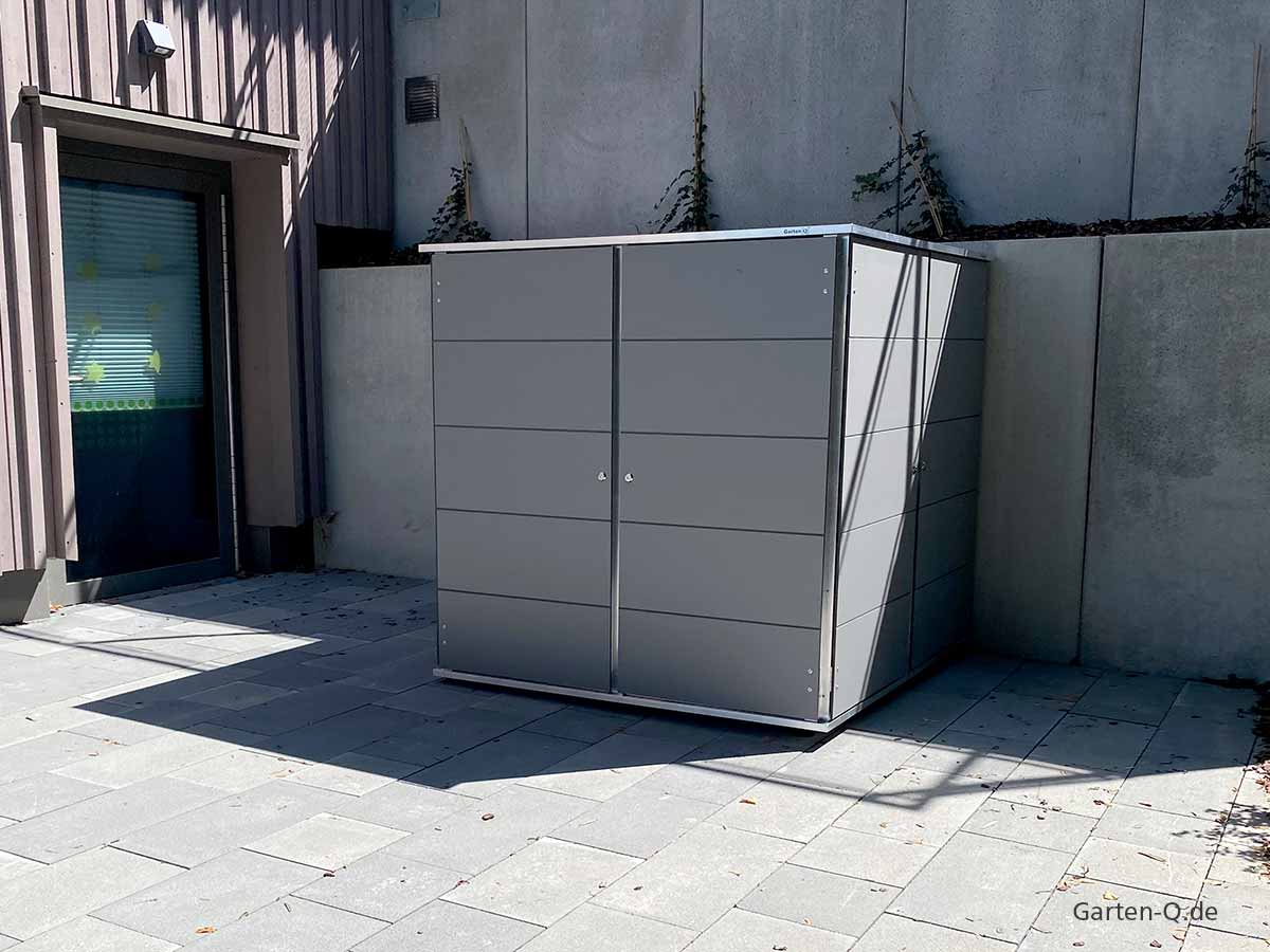 A chic cube with an edge length of only 158cm stores everything you need garden tools. From seat cushions, lawn mower and grill to children's toys, flower pots and tools. Everything always at hand behind individual doors.